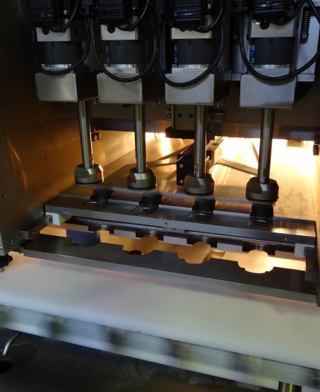 The capping station receives caps from the cap sorter and screws them onto the bottles immediately after filling. Capping chucks are loaded using an accurate pick-and-place method and each has its own torque-limiting servo to accurately apply the correct torque. Height adjustments to the capping station are automatically set for changes in bottles sizes and controlled via recipes set using the HMI touchscreen.