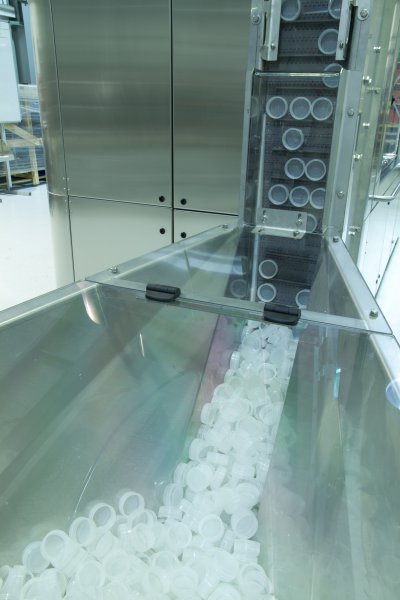 Cap storage is provided with the cap sorter hopper. As caps lift out of the hopper, they are orientated correctly and elevated to the top of the filler where they feed into the cap delivery track. Sensors double check for cap orientation and damaged and faulty caps are automatically ejected. Along the cap delivery track, the caps are sterilised using vapourised H2O2 and UVC light, and decontaminated in the exactly the same way as the bottles. Sterile caps are automatically indexed into the capper ready for capping onto bottles.